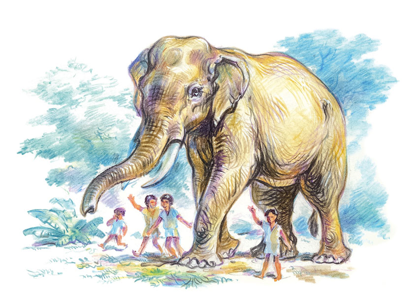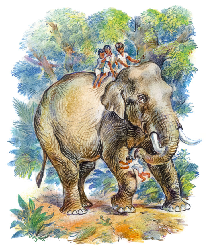 Слон прошёл мимо нас; смотрим, сворачивает с дороги и попёр в кусты. Кусты плотные, колючие, стеной растут. А он через них, как через бурьян, – только ветки похрустывают, – перелез и пошёл к лесу. Остановился около дерева, взял хоботом ветку и пригнул ребятам. Те сейчас же повскакали на ноги, схватились за ветку и что-то с неё обирают. А маленький подскакивает, старается тоже себе ухватить, возится, будто он не на слоне, а на земле стоит. Слон пустил ветку и другую пригнул. Опять та же история. Тут уж маленький совсем, видно, в роль вошёл: совсем залез на эту ветку, чтоб ему тоже досталось, и работает. Все закончили, слон пустил ветку, а маленький-то, смотрим, так и полетел с веткой. Ну, думаем, пропал – полетел теперь, как пуля, в лес. Бросились мы туда. Да нет, куда там! Не пролезть через кусты: колючие, и густые, и путаные. Смотрим, слон в листьях хоботом шарит. Нащупал этого маленького – он там, видно, обезьянкой уцепился – достал его и посадил на место. Потом слон вышел на дорогу впереди нас и пошёл обратно. Мы – за ним. Он идёт и по временам оглядывается, на нас косится: чего, мол, сзади идут какие-то?