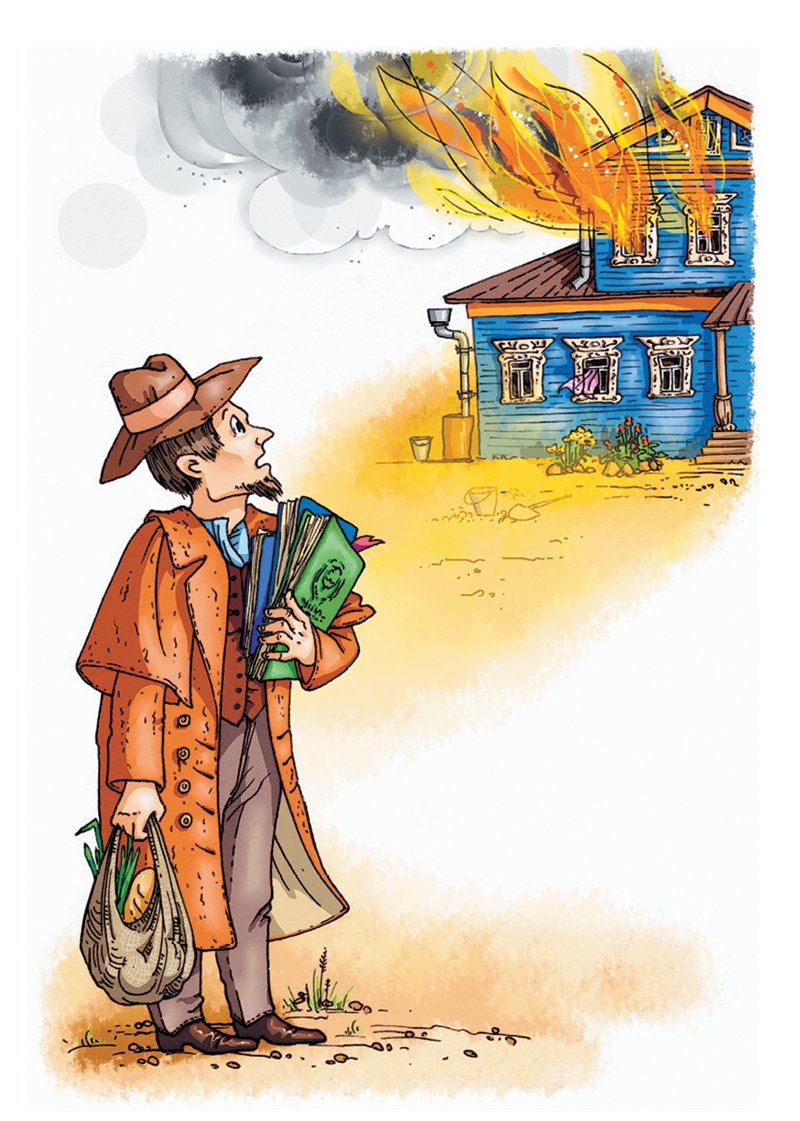 Учи́тель шёл домо́й и увида́л, что из ве́рхних о́кон идёт дым. Он побежа́л к сто́лбику, где за стекло́м была́ сде́лана кно́пка. Э́то звоно́к к пожа́рным.