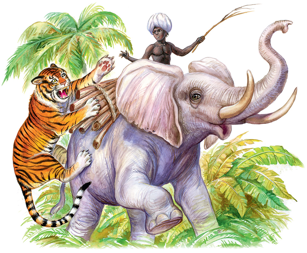 Хозяин поднял ветку, чтоб со всей силы ударить слона, но вдруг из кустов выскочил огромный тигр. Он хотел напасть на слона сзади и вскочить на спину.