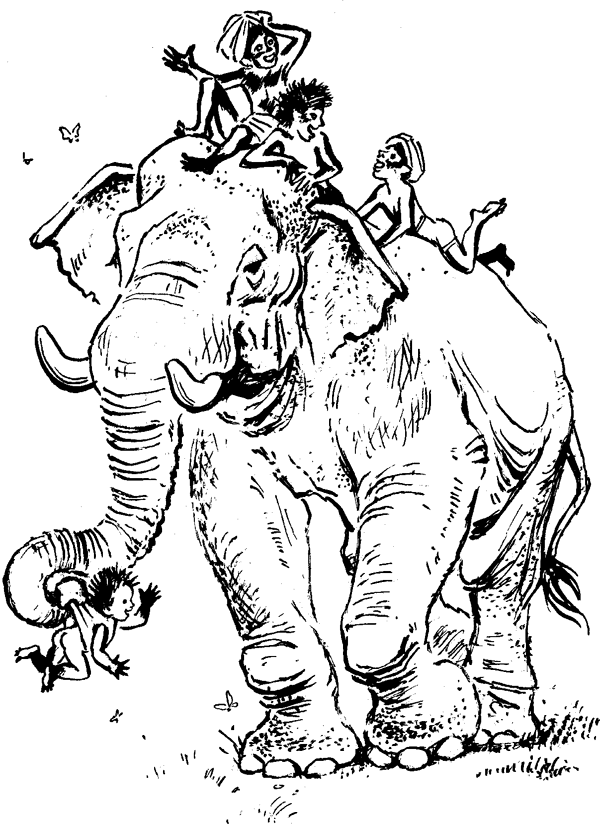 «Вот, – думаю, – здо́рово: им нечего там бояться. Если б и тигр попался навстречу, слон тигра поймает, схватит хоботищем поперек живота, сдавит, швырнет выше дерева и, если на клыки не подцепит, все равно будет ногами топтать, пока в лепешку не растопчет».