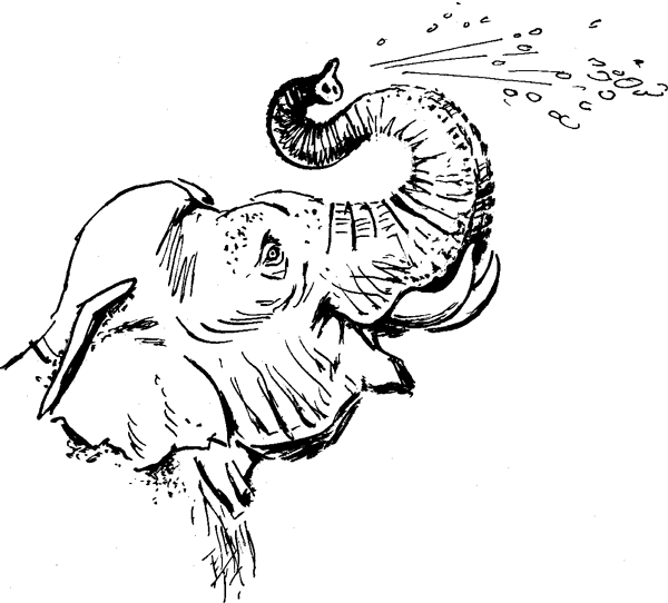 А ребята боятся в воду лезть – больно уж быстрое течение, унесет. Скачут на берегу и давай в слона камешками кидать. Ему нипочем, он даже внимания не обращает – все своего слоненка моет. Потом, смотрю, набрал в хобот воды и вдруг как повернет на мальчишек и одному прямо в пузо как дунет струей – тот так и сел. Хохочет, заливается.