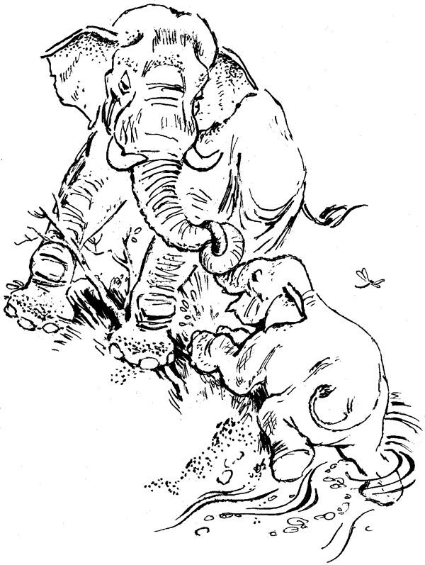 Слон вышел на берег; слоненок ему хобот протянул, как руку. Слон заплел свой хобот об его и помог ему на обрывчик вылезти.