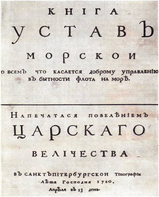 Фото 2. Титульный лист книги «Устав морской о всём, что касается доброму управлению в бытность флота на море», 1720 год