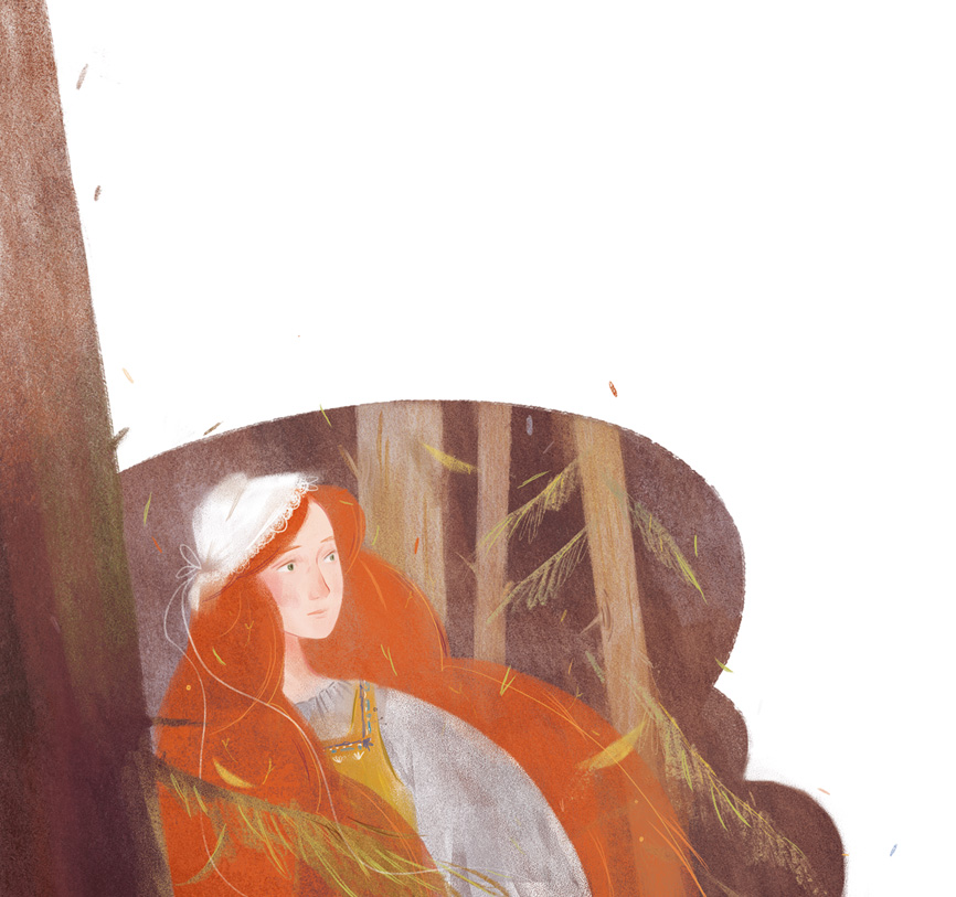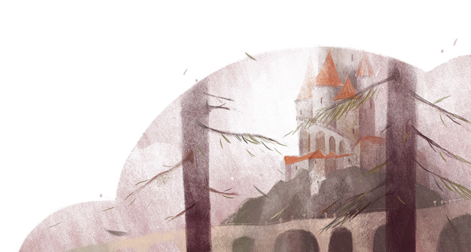 Вот Золушка влезла, как белка, на сосну, стала смотреть во все стороны, нет ли где человеческого жилья, и увидела вдалеке большой замок. Золушка запомнила хорошенько, в какой он стороне, слезла с дерева, рассказала о замке сёстрам – и они пустились в дорогу.