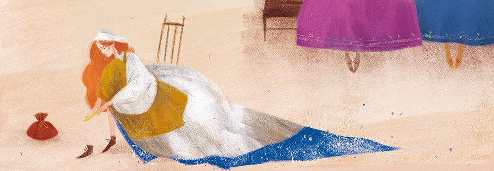 Прочитав эти слова, Золушка заглянула в сундучок – и нашла белое платье, расшитое золотом и усыпанное драгоценными камнями. Всё, что полагалось к роскошному наряду, лежало на дне сундучка; наконец Золушка достала чудные золотые туфельки. Тщеславной она не была, но против такого богатого наряда как устоять. Девушка поскорее вернулась в дом, сняла запачканное золой платье, чисто умылась и поспешила назад в погреб. Там она достала из сундука платье и оделась. С головы до ног, до крохотных туфелек, всё подошло ей как нельзя лучше, словно на неё было сшито.