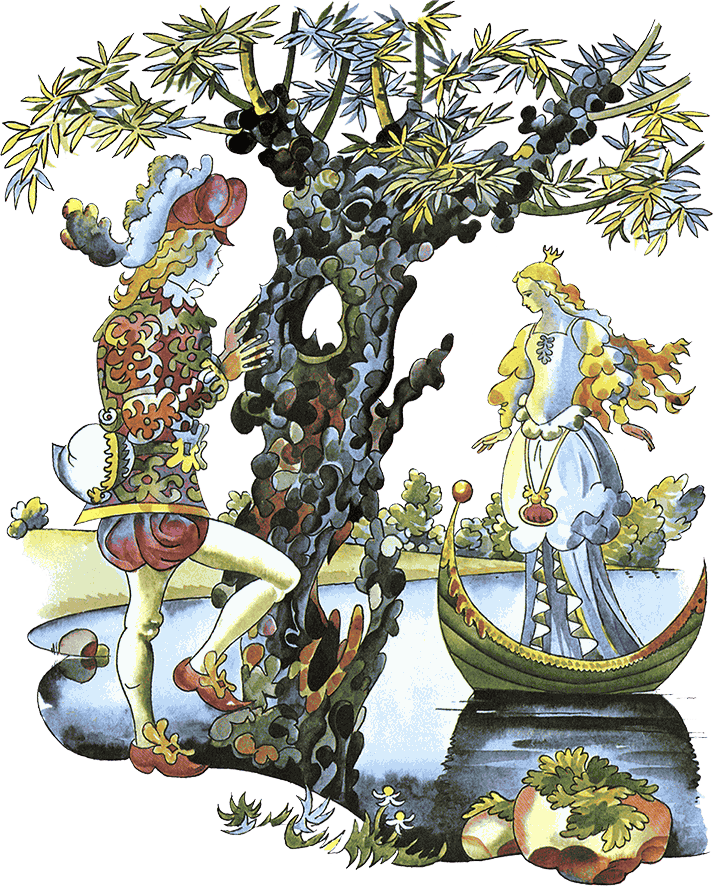 – Слезай, – говорит она Штернберку, – и жди – придёт принцесса, станет по озеру кататься, увидит тебя и сюда приплывёт. Как начнёт она тебя выспрашивать, чего тебе здесь надобно, отвечай, что ты, мол, чужеземный купец, везёшь сокровища и среди них золотой башмачок. Она захочет на него поглядеть, ты покажи, а сам поскорее обними её и садись мне на спину.