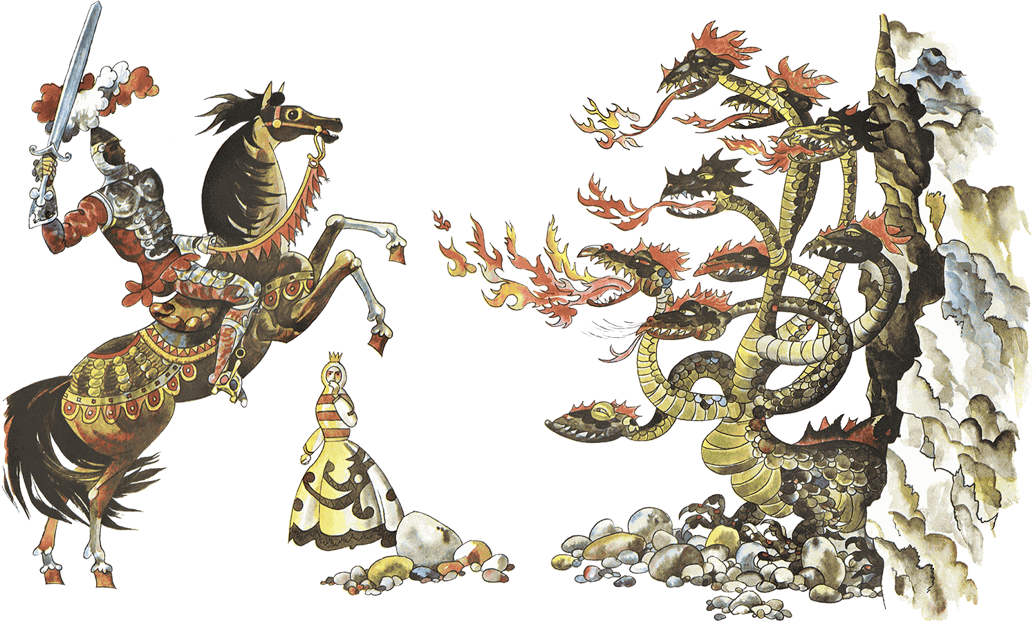 На третий день повезли к дракону Славену. С ней поехал и сам король. Сердце бедняжки принцессы дрожало от страха. Но вдруг раздался радостный возглас: «Рыцарь едет!»
