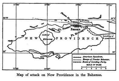 Preparations for attack were quickly made. Commodore Hopkins, having impressed some local schooners, loaded them with two hundred and fifty marines from the squadron, under the command of Captain Samuel Nichols, the ranking officer of the corps, and fifty seamen under the command of Lieutenant Thomas Weaver of the Cabot, and on March 2d the transports with this attacking force were dispatched to New Providence.3 They were convoyed by the Providence and the Wasp, and a landing was effected under the cover of these two ships of war. Unfortunately, however, some of the other larger vessels got under way at the same time, and their appearance alarmed the town.