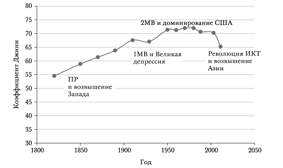 До начала промышленной революции на Западе глобальное неравенство было умеренным, и оно объяснялось почти в равной степени как различиями между людьми, живущими в одной и той же стране, так и разницей средних доходов людей в разных странах. Ситуация резко изменилась с возвышением Запада. Глобальное неравенство росло почти непрерывно с 1820 года до кануна Первой мировой войны, поднявшись с 55 пунктов Джини (что примерно соответствует сегодняшнему уровню неравенства в странах Латинской Америки) до почти 70 (выше, чем уровень неравенства в сегодняшней ЮАР). За этим ростом стояло главным образом повышение уровня доходов в Европе, Северной Америке, а потом и в Японии (в сочетании со стагнацией Китая и Индии), хотя определенную роль сыграло и растущее неравенство доходов внутри стран, которые становились первым миром. После 1918 года глобальное неравенство ненадолго пошло вниз, благодаря событиям, которые на фоне широкого исторического полотна, с которым мы работаем, выглядят как краткие вспышки Первой мировой войны и Великой депрессии, когда доходы в западных странах перестали расти.