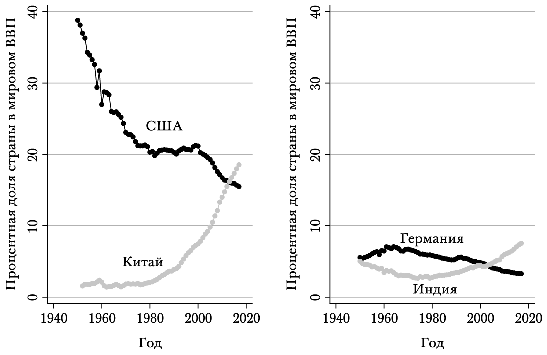 РИСУНОК 1.2. Процентная доля мирового ВВП, которая приходится на США в сравнении с Китаем и на Германию в сравнении с Индией, 1950–2016
