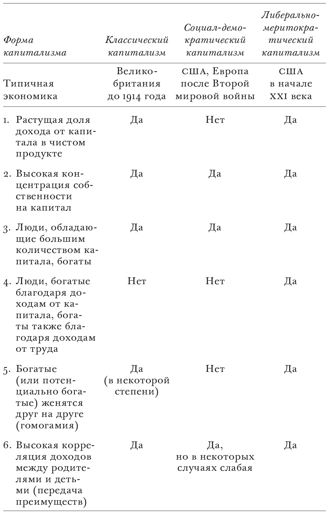 Лучше всего понять либерально-меритократический капитализм, противопоставив его отличительные особенности особенностям классического капитализма XIX века и социал-демократического капитализма, в том виде, в каком он существовал в период между окончанием Второй мировой войны и началом 1980-х годов в Западной Европе и Северной Америке. Здесь мы имеем дело с «идеально-типическими» характеристиками систем и игнорируем детали, которые различались в зависимости от конкретной страны и времени. Но в следующих разделах, где я сосредотачиваюсь на либерально-меритократическом капитализме, я подробно обсуждаю эти особенности для страны, которую можно принять в качестве прототипа, а именно Соединенных Штатов.