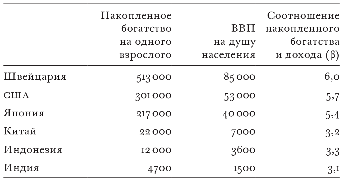 Чтобы увидеть, как сильно влияет рост дохода от капитала в сочетании с высокой концентрацией собственности на капитал на неравенство доходов в целом, нужно взглянуть на эти связи в динамике. По мере того как страны становятся богаче, они накапливают все больше богатства за счет сбережений и успешных инвестиций (как и отдельные люди). Более того, прирост их капиталов опережает рост их доходов, и они постепенно становятся более «капиталоемкими» или «богатыми капиталом». Эта взаимосвязь – соотношение между капиталом и доходом – стала центральной чертой «Капитала в XXI веке» Пикетти. Страны с более высокими доходами (ВВП на душу населения) не только имеют больше имущества на человека, но и соотношение между капиталом и доходом (обозначаемое β) в них выше (таблица 2.2). Так, с точки зрения ВВП на душу населения Швейцария в 53 раза опережает Индию, но имеет почти в 100 раз больше имущества на одного взрослого, чем Индия.