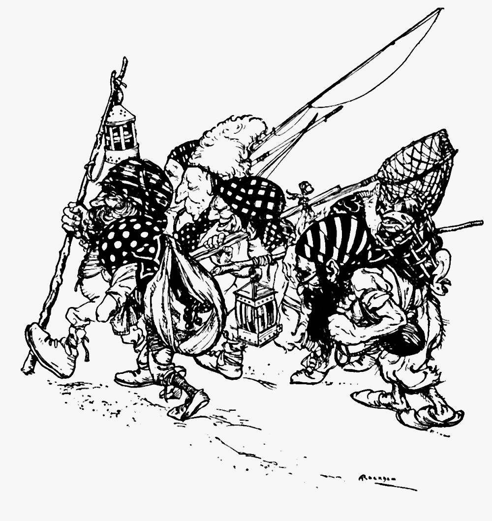 Der Räuber, der bei der Erzählung ganz kreideweiß geworden war, sprang auf und wollte entfliehen, aber die Gäste hielten ihn fest und überlieferten ihn den Gerichten. Da ward er und seine ganze Bande für ihre Schandtaten gerichtet.