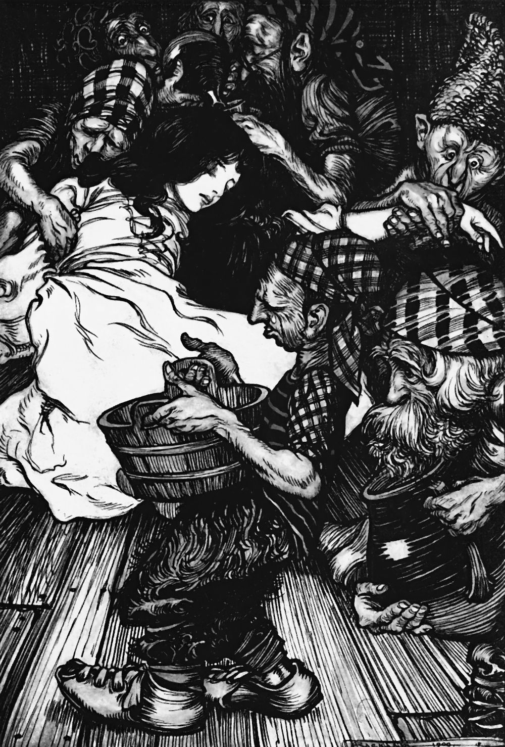 Mit der zweiten Frau hatte er eine Tochter; das Kind aber von der ersten Frau war ein kleiner Sohn, und war so rot wie Blut und so weiß wie Schnee. Wenn die Frau ihre Tochter so ansah, so hatte sie sie sehr lieb; aber dann sah sie den kleinen Jungen an, und das ging ihr so durchs Herz, und es dünkte sie, als stünde er ihr überall im Wege, und sie dachte dann immer, wie sie ihrer Tochter all das Vermögen zuwenden wollte, und der Böse gab es ihr ein, daß sie dem kleinen Jungen ganz gram wurde, und sie stieß ihn aus einer Ecke in die andere, und puffte ihn hier und knuffte ihn dort, so daß das arme Kind immer in Angst war. Wenn er dann aus der Schule kam, so hatte er keinen Platz, wo man ihn in Ruhe gelassen hätte.