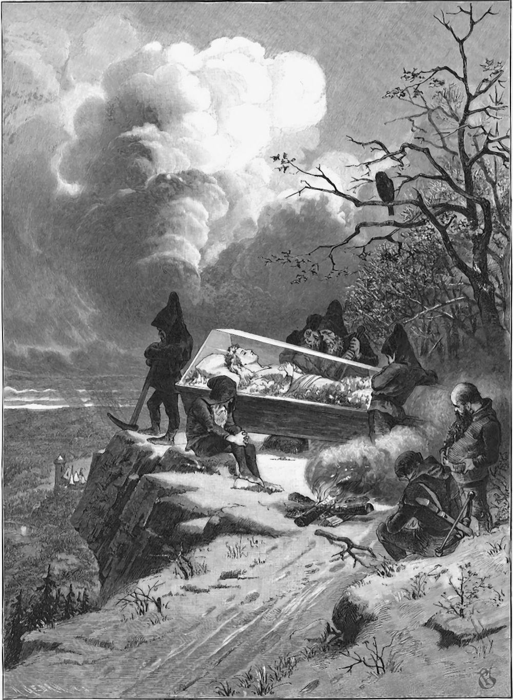 Nun lag Schneewittchen lange, lange Zeit in dem Sarge und verweste nicht, sondern sah aus als wenn es schliefe, denn es war noch so weiß als Schnee, so rot als Blut und so schwarzhaarig wie Ebenholz. Es geschah aber, daß ein Königssohn in den Wald geriet und zu dem Zwergenhaus kam, da zu übernachten. Er sah auf dem Berg den Sarg und das schöne Schneewittchen darin, und las, was mit goldenen Buchstaben, darauf geschrieben war. Da sprach er zu den Zwergen: »Laßt mir den Sarg, ich will euch geben, was ihr dafür haben wollt.« Aber die Zwerge antworteten: »Wir geben ihn nicht um alles Gold in der Welt.« Da sprach er: »So schenkt mir ihn, denn ich kann nicht leben, ohne Schneewittchen zu sehen, ich will es ehren und hochachten wie mein Liebstes.« Wie er so sprach, empfanden die guten Zwerglein Mitleid mit ihm und gaben ihm den Sarg. Der Königssohn ließ ihn nun von seinen Dienern auf den Schultern forttragen. Da geschah es, daß sie über einen Strauch stolperten, und von dem Schüttern fuhr der giftige Apfelgrütz, den Schneewittchen abgebissen hatte, aus dem Hals. Und nicht lange so öffnete es die Augen, hob den Deckel vom Sarg in die Höhe, und richtete sich auf und war wieder lebendig. »Ach Gott, wo bin ich?« rief es. Der Königssohn sagte voll Freude: »Du bist bei mir«, und erzählte, was sich zugetragen hatte und sprach: »Ich habe dich lieber als alles auf der Welt; komm mit mir in meines Vaters Schloß, du sollst meine Gemahlin werden.« Da war ihm Schneewittchen gut und ging mit ihm, und ihre Hochzeit ward mit großer Pracht und Herrlichkeit angeordnet.