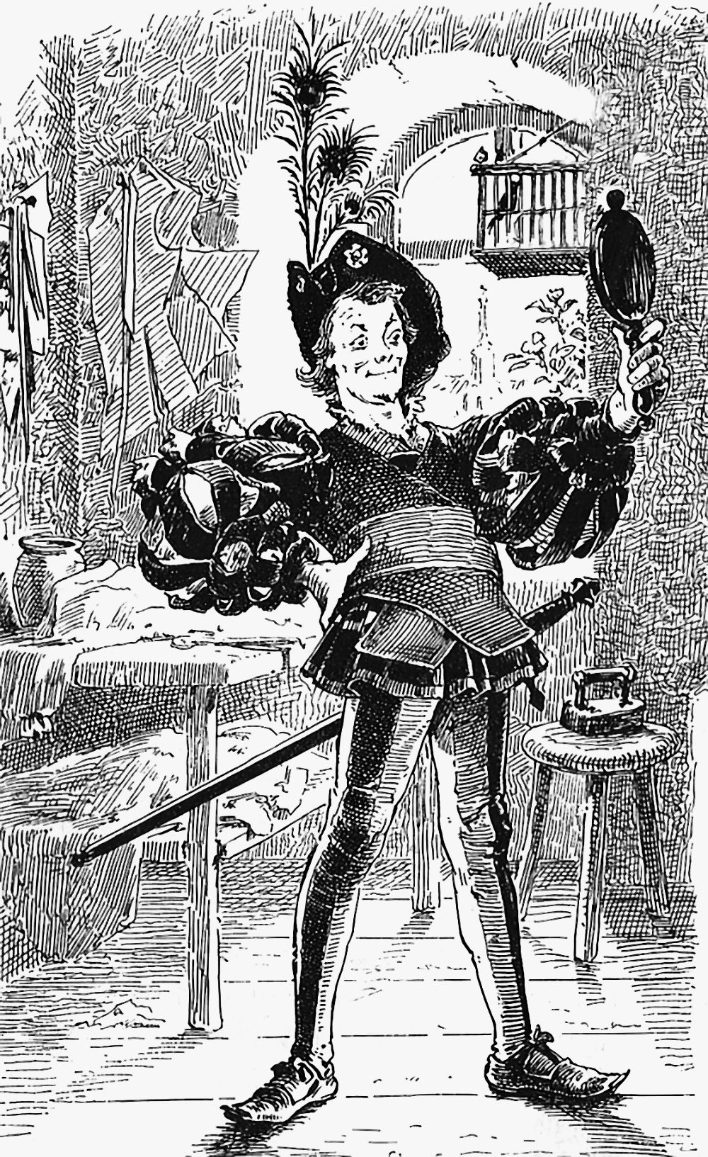 Nach einiger Zeit hörte die junge Königin in der Nacht, wie ihr Gemahl im Traume sprach: »Junge, mach mir den Wams und flick mir die Hosen, oder ich will dir die Elle über die Ohren schlagen.« Da merkte sie, in welcher Gasse der junge Herr geboren war, klagte am anderen Morgen ihrem Vater ihr Leid und bat, er möchte ihr von dem Manne helfen, der nichts anderes als ein Schneider wäre. Der König sprach ihr Trost zu und sagte: »Laß in der nächsten Nacht deine Schlafkammer offen, meine Diener sollen außen stehen und wenn er eingeschlafen ist, hineingehen, ihn binden und auf ein Schiff tragen, das ihn in die weite Welt führt.« Die Frau war damit zufrieden, des Königs Waffenträger aber, der alles mit angehört hatte, war dem jungen Herrn gewogen und hinterbrachte ihm den ganzen Anschlag. »Dem Dinge will ich einen Riegel vorschieben«, sagte das Schneiderlein. Abends legte es sich zu gewöhnlicher Zeit mit seiner Frau zu Bett; als sie glaubte, er sei eingeschlafen, stand sie auf, öffnete die Tür und legte sich wieder. Das Schneiderlein, das sich nur stellte, als wenn es schlief, fing an mit heller Stimme zu rufen: »Junge, mach den Wams und flick mir die Hosen, oder ich will dir die Elle über die Ohren schlagen! Ich habe sieben mit einem Streich getroffen, zwei Riesen getötet, ein Einhorn fortgeführt, und ein Wildschwein gefangen, und sollte mich vor denen fürchten, die draußen vor der Kammer stehen!« Als diese den Schneider also sprechen hörten, überkam sie eine große Furcht, sie liefen, als wenn das wilde Heer hinter ihnen wäre, und keiner wollte sich mehr an ihn wagen. Also war und blieb das Schneiderlein sein Lebtag ein König.