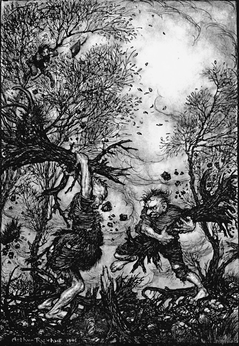 Das Mädchen erzählte alles was ihm begegnet war, und als die Mutter hörte, wie es zu dem großen Reichtum gekommen war, wollte sie der anderen häßlichen und faulen Tochter gern dasselbe Glück verschaffen. Sie mußte sich an den Brunnen setzen und spinnen; und damit ihre Spule blutig ward, stach sie sich in den Finger und stieß sich die Hand in die Dornhecke. Dann warf sie die Spule in den Brunnen und sprang selber hinein. Sie kam, wie die andere, auf die schöne Wiese und ging auf demselben Pfade weiter. Als sie zu dem Backofen gelangte, schrie das Brot wieder: »Ach, zieh mich raus, zieh mich raus, sonst verbrenn ich, ich bin schon längst ausgebacken.« Die Faule aber antwortete: »Da hätt ich Lust, mich schmutzig zu machen«, und ging fort. Bald kam sie zu dem Apfelbaum, der rief: »Ach schüttle mich, schüttle mich, wir Äpfel sind alle miteinander reif.« Sie antwortete aber: »Du kommst mir recht, es könnte mir einer auf den Kopf fallen«, und ging damit weiter. Als sie vor der Frau Holle Haus kam, fürchtete sie sich nicht, weil sie von ihren großen Zähnen schon gehört hatte und verdingte sich gleich zu ihr.