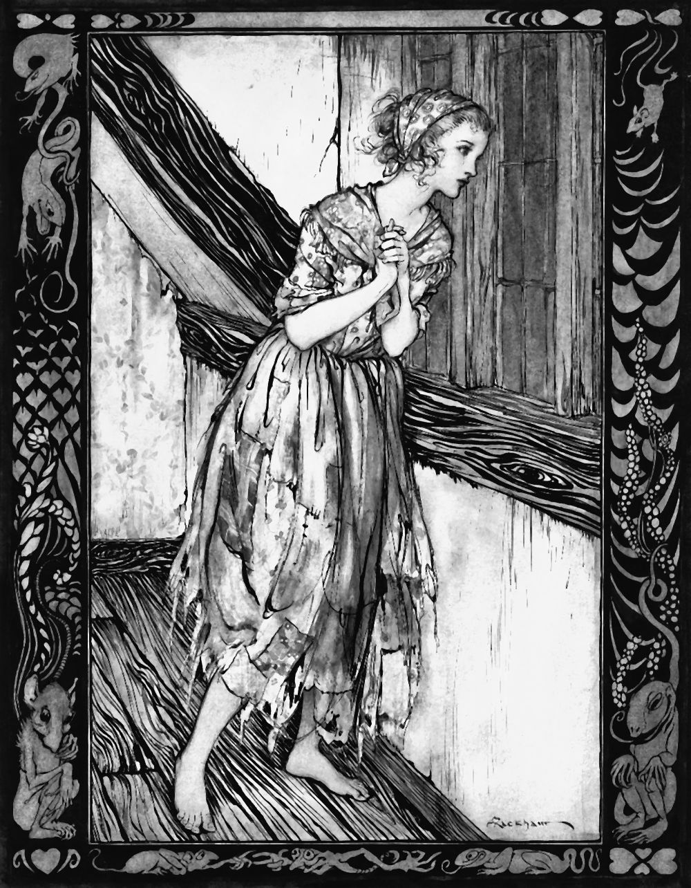 Die Frau hatte zwei Töchter mit ins Haus gebracht, die schön und weiß von Angesicht waren, aber garstig und schwarz von Herzen. Da ging eine schlimme Zeit für das arme Stiefkind an. »Soll die dumme Gans bei uns in der Stube sitzen!« sprachen sie, »wer Brot essen will, muß es verdienen; hinaus mit der Küchenmagd.« Sie nahmen ihm seine schönen Kleider weg, zogen ihm einen grauen alten Kittel an und gaben ihm hölzerne Schuhe. »Seht einmal die stolze Prinzessin, wie sie geputzt ist!« riefen sie, lachten und führten es in die Küche. Da mußte es von Morgen bis Abend schwere Arbeit tun, früh vor Tag aufstehen, Wasser tragen, Feuer anmachen, kochen und waschen. Obendrein taten ihm die Schwestern alles ersinnliche Herzeleid an, verspotteten es und schütteten ihm die Erbsen und Linsen in die Asche, sodaß es sitzen und sie wieder auslesen mußte. Abends, wenn es sich müde gearbeitet hatte, kam es in kein Bett, sondern mußte sich neben den Herd in die Asche legen. Und weil es darum immer staubig und schmutzig aussah, nannten sie es Aschenputtel.