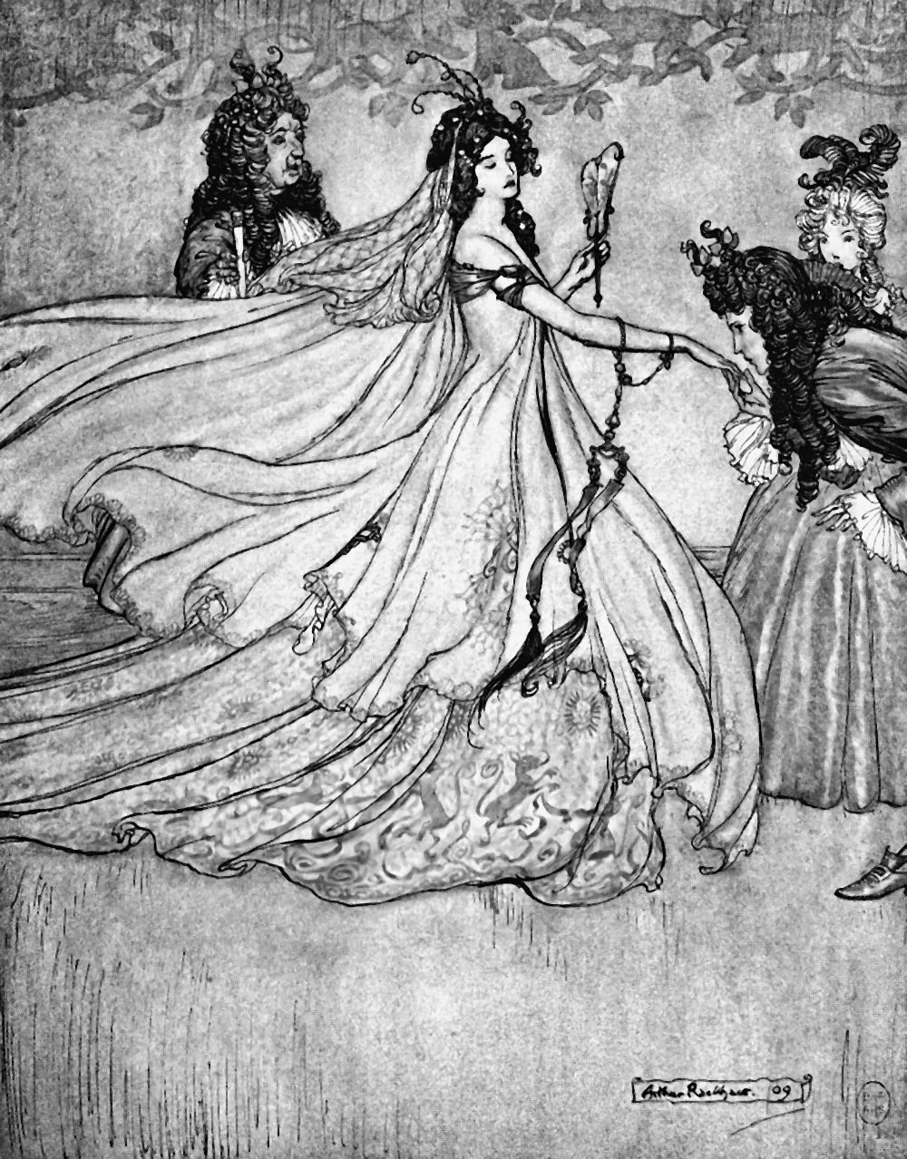 »Bäumchen, rüttle dich und schüttle dich,wirf Gold und Silber über mich.«Nun warf ihm der Vogel ein Kleid herab, das war so prächtig und glänzend wie es noch keins gehabt hatte, und die Pantoffeln waren ganz golden. Als es in dem Kleid zu der Hochzeit kam, wußten sie alle nicht, was sie vor Verwunderung sagen sollten. Der Königssohn tanzte ganz allein mit ihm, und wenn es einer aufforderte, sprach er: »Das ist meine Tänzerin.«