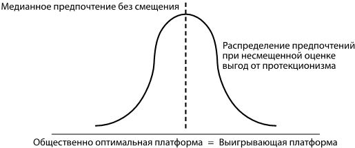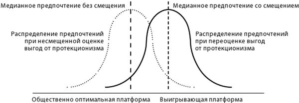 Однако такой вывод не впечатлит никого, кому приходилось преподавать экономику международной торговли. Необходимо часами терпеливо растолковывать студентам прелести сравнительных преимуществ. Однако после финального экзамена неизменно сохраняется огорчительно высокий уровень рецидива. Предположим, что мы будем исходить из более реалистичного допущения, что избиратели систематически переоценивают выгоды от протекционизма. Что происходит в этом случае? Многие из тех, кто предпочитает последствия свободной торговли, голосуют за протекционизм, но мало кто из тех, кто предпочитает последствия протекционизма, голосуют за свободу торговли. Политический баланс нарушается, и выигрывает излишне протекционистская платформа. Медианный избиратель выиграл бы, если бы получил меньше протекционизма, чем он попросил. Но конкуренция заставляет политиков выполнять пожелания избирателей, а не заботиться о том, что для них лучше.