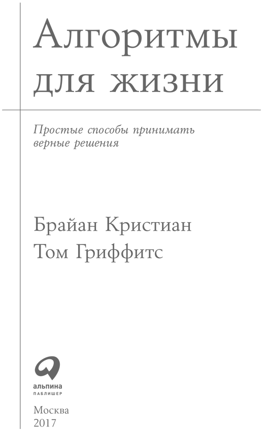 В сущности, люди регулярно сталкиваются с рядом особо сложных задач, изучаемых программистами. Зачастую нам приходится принимать решения в условиях неопределенности, временных ограничений, неполной информации и быстро меняющейся реальности. В некоторых подобных случаях даже новейшие компьютерные технологии пока не могут предложить нам эффективные и всегда верные алгоритмы. Для определенных ситуаций, как оказывается, таких алгоритмов еще не существует. Но даже в тех случаях, для которых тот самый идеальный алгоритм еще не найден, битва нескольких поколений ученых с наиболее труднорешаемыми жизненными задачами тоже принесла свои плоды. Эти выводы и правила, полученные ценой огромных усилий, идут вразрез с нашими привычными понятиями о рациональности и напоминают исключительно строгие предписания математика, который пытается изобразить мир четкими ровными линиями. Нам говорят: «Не надо рассматривать все имеющиеся варианты», «Не ведись на выгоду каждый раз», «Иногда можно и дров наломать», «Путешествуй налегке», «Пусть все подождет», «Доверься своей интуиции и не раздумывай слишком долго», «Расслабься», «Подкинь монетку», «Прощай, но не забывай», «Будь честен с самим собой».