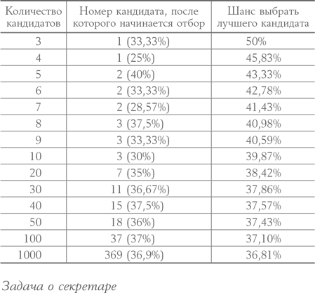 Как оказывается, следование оптимальной стратегии в конечном итоге дает нам 37 %-ный шанс принять на работу лучшего кандидата. Одновременно в этой цифре заключается и уникальная математическая симметрия этой задачи: число, определяющее стратегию, и процент вероятности успеха совпадают. В таблице выше рассмотрены оптимальные стратегии для решения задачи о секретаре при различном количестве претендентов, при этом очевидно, что показатель вероятности успеха и точка отсчета для начала отбора кандидатов приближаются к отметке 37 % при возрастании общего количества кандидатов.
