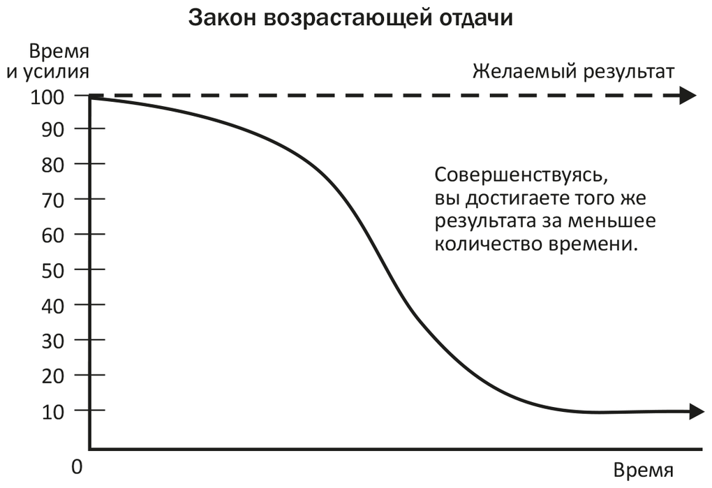 Закон возрастающей отдачиЗакон возрастающей отдачи, применяемый к использованию процесса фокусирования, – это закон, обратный небезызвестному закону убывающей отдачи. Закон возрастающей отдачи говорит о том, что чем больше вы сосредоточиваетесь на выполнении небольшого количества заданий, представляющих для вас наибольшую ценность, тем лучше станете в них разбираться и тем меньше времени будет у вас уходить на их выполнение. Прибыль от затраченных усилий и энергии возрастает. Это еще один способ вдвое увеличить свой доход и сократить рабочее время.