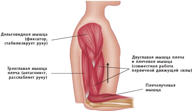 Рис. 1.8. Сгибание локтевого сустава, при котором плечевая мышца и двуглавая мышца плеча выступают в качестве первичной движущей силы, трехглавая мышца плеча является антагонистом, а плечелучевая мышца – мышцей-синергистом