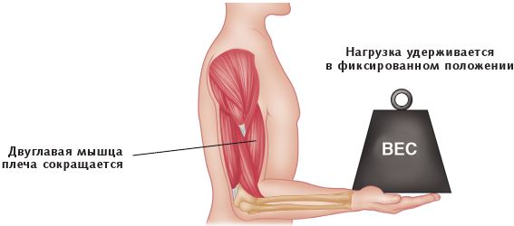 Основная функция мышцы – ее укорачивание. Когда места прикрепления мышцы сближаются, это называется концентрическим сокращением. Поскольку происходит движение сустава, концентрические сокращения также можно считать динамическими. В качестве примера приведем удерживание предмета: при выполнении данного действия двуглавая мышца плеча сокращается концентрически, локтевой сустав сгибается, а рука поднимается вверх к плечу.