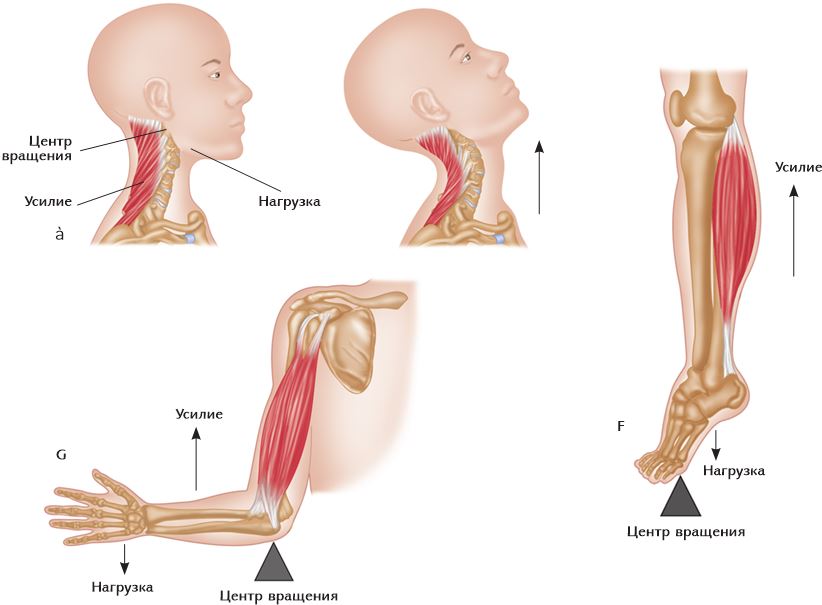 Рис. 1.11. Примеры рычагов в человеческом теле: a – рычаг первого класса; b – рычаг второго класса; c – рычаг третьего класса