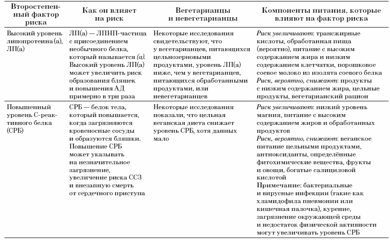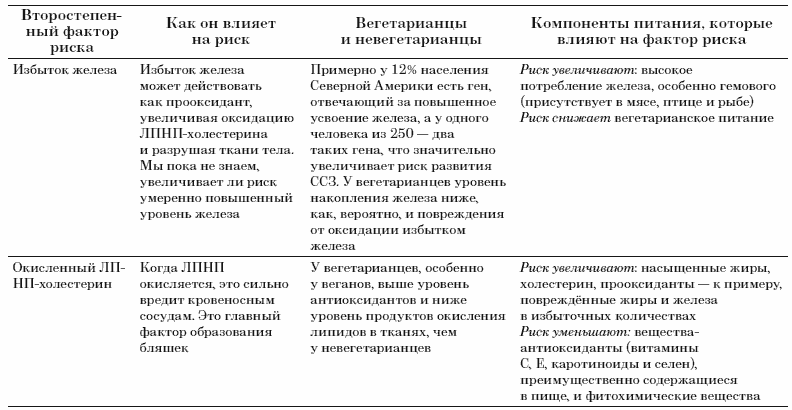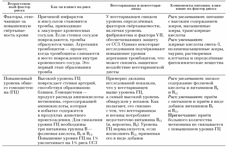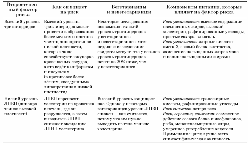 Четвёртый столбец позволяет нам многое осмыслить в изначальном вопросе: «Почему у вегетарианцев есть преимущества?». Вегетарианское питание содержит значительно меньше продуктов, способствующих ССЗ, в то же время оно богаче продуктами, обеспечивающими защиту. Однако есть некоторые защитные элементы, которые либо присутствуют недостаточно, либо полностью отсутствуют при вегетарианском питании, как показывает таблица 2.3. Это может в некоторой степени сократить преимущества вегетарианского питания, снижая его защитный потенциал. Возможно, это объясняет, почему коллективные исследования показывают, что у веганов уровень ССЗ выше ожидаемого, если основываться на уровне холестерина в крови. Если вегетарианцы хотят максимально снизить риск, они должны знать об этих компонентах и соответственно включать их в питание.
