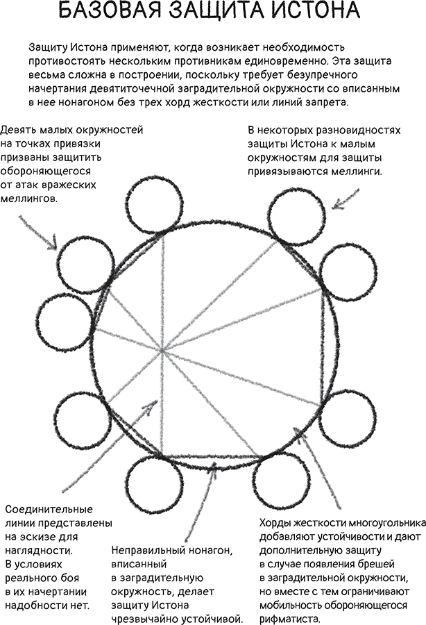 – Отличительной чертой защиты Истона является немалое число окружностей меньших размеров, расположенных в точках привязки. Под немалым я подразумеваю число девять. Нарисовать девять окружностей в условиях скоротечного боя задача отнюдь не тривиальная, однако, если вам это удастся, ваши труды не пропадут втуне. Эти девять окружностей сослужат вам хорошую службу и откроют широкие возможности для защиты. Как вы и сами видите, линии запрета образуют неправильный нонагон. Они призваны стабилизировать вашу заградительную окружность. Однако чем меньше этих линий, тем больше у вас пространства для маневра. Кроме того, если вы придерживаетесь мнения, что лучшая защита – это нападение, то всегда можете использовать точки привязки для создания армии меллингов.