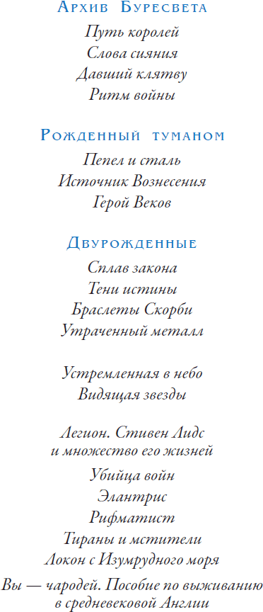 Также в реализации проекта приняли участие сотрудники моего издательства «Dragonsteel». Это арт-директор ᛁᛋᚫᚫᚳ Стюарт, его ассистенты Рэйчел Линн Бьюкенен и Дженнифер Нил, а также собравший результаты их труда в одно целое Билл Уирн, специалист по печати.