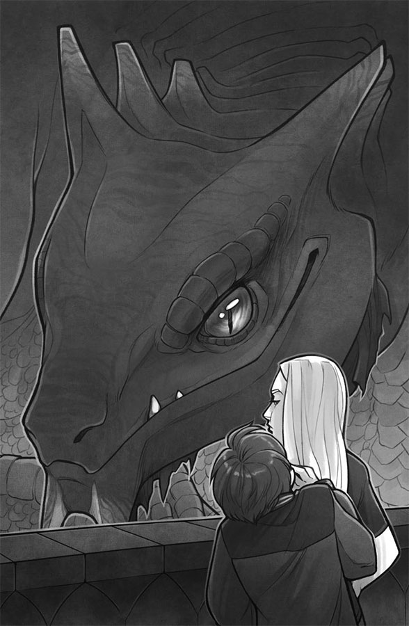 Тут я заметил, что на спине у бескрылого, рогатого пресмыкающегося имелось некое устройство вроде гондолы. Посрамляя земное тяготение, увесистое с виду создание прилипало к каменным фасадам, как ящерица к скале, вот только пасть этой «ящерки» без труда вместила бы автобус. Достигнув замка Смедри, дракон влез прямо к нашему балкону – только когти скрежетали по каменной кладке. Я невольно попятился, когда, высунувшись над ограждением балкона, на нас уставилась громадная змеиная голова.