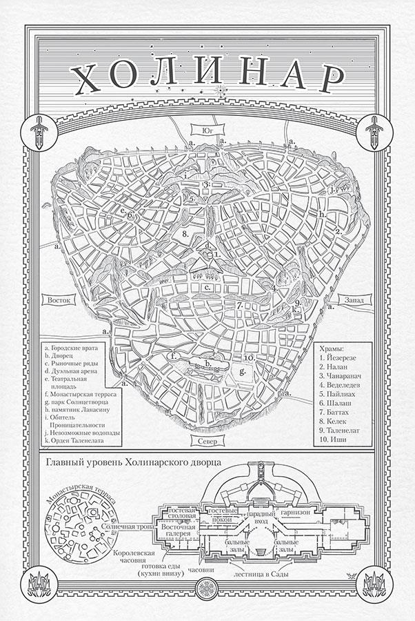 Отличительной чертой Холинара, конечно же, были ветролезвия: любопытные скальные образования, которые поднимались из камня, будто плавники какого-то гигантского существа, большей частью скрытого под поверхностью. Изогнутые скалы покрывали пласты красного, белого и оранжевого цвета, темные и блестящие от дождя. Он лишь теперь понял, что городские стены отчасти построены на вершинах наружных ветролезвий. Ну да – нижние участки стен буквально выросли из земли, и люди выстроили на них укрепления, выровняв вершины и заполнив пространства между изгибами.