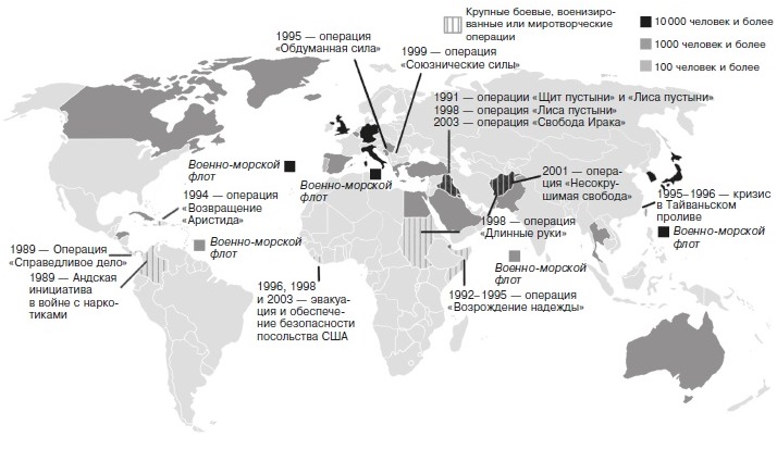 Рис. 1. Военные операции и развертывание Вооруженных сил США после окончания холодной войны