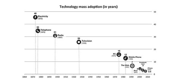 На протяжении последних двухсот лет мы наблюдаем не только нескончаемую череду прорывов[7], выражающихся во внедрении все более совершенных технологий, но и резкое ускорение инновационных циклов. Исследователи часто говорят об этом как о технологическом проникновении, или «диффузии» инноваций. Чем шире применяется новшество, тем меньше сопротивления оно встречает в обществе. По мере того как мир становится все более взаимосвязанным, новые технологии проникают на самые разнообразные рынки и усваиваются значительно быстрее, нежели это было возможно в прошлом. Вскоре такие средства, как 3D-печать, и вовсе позволят получать новейшие высокотехнологичные продукты быстрее, чем их доставляют дроны службы Amazon Prime[8].