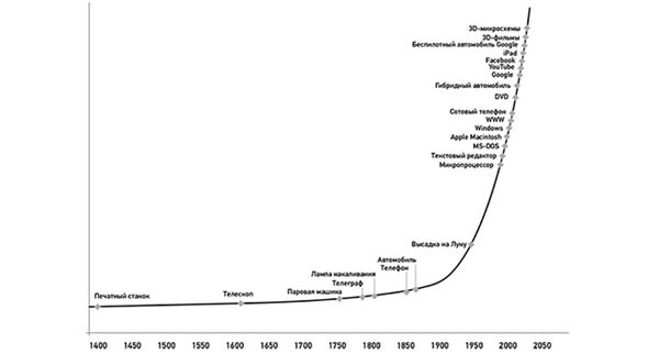 На рисунке 1.2 показано ускорение темпов развития технологий за последние 600 лет. На профессиональном жаргоне статистиков такая кривая называется «хоккейной клюшкой» и свидетельствует об экспоненциальном росте частоты исследуемого явления. В XX веке подобные впечатляющие графики публиковались регулярно, особенно в качестве убедительной иллюстрации ускорения технологического прогресса. Футуролог Рэй Курцвейл[11] воспользовался открытым математиком Джоном фон Нейманом[12] принципом сингулярности для объяснения динамики технологического прогресса. В модели Курцвейла точкой технологической сингулярности назван момент ускорения темпа открытий до скорости, при которой прогресс выходит за пределы человеческого понимания. Теоретически это означает, что любая стоящая перед человечеством задача в дальнейшем окажется решаемой, но только численными методами, благодаря неограниченно наращиваемым мощностям вычислительной техники.