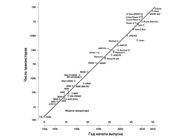 Единственный фундаментальный объективный показатель темпов ускоренного продвижения микропроцессорных технологий известен как закон Мура. Он сформулирован на основе наблюдений за историей развития полупроводниковой аппаратной базы вычислительной техники, согласно которым число транзисторов в интегральной схеме удваивается приблизительно каждые два года. Сегодня мы наблюдаем небольшое отставание темпов роста от закона Мура, обусловленное физическими ограничениями, но на протяжении полувека он работал с пугающей точностью. Закон назван в честь соучредителя Intel Corporation Гордона Мура, впервые описавшего эту тенденцию в технической статье в 1965 году[13].