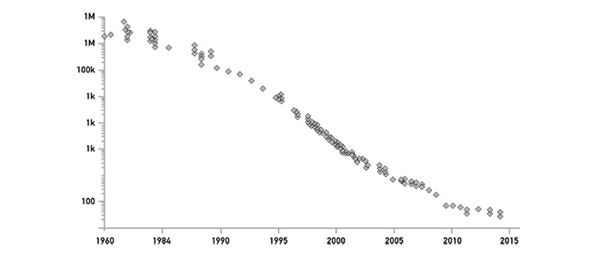 Рисунок 1.7. Снижение стоимости хранения информации (в пересчете на 1 ГБ) в период с 1980 по 2015 год