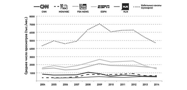 По данным веб-сайта TheRichest.com, самым просматриваемым сетевым телеканалом мира является спортивный ESPN, самый популярный из новостных – Fox News – занимает третье место, а замыкает ведущую десятку CNN. Острее всего проблема борьбы за зрителя стоит перед вечерними новостными кабельными каналами и теми, которые освещают спортивные события всемирного значения, такие как чемпионаты мира по футболу. Если проанализировать статистику аудитории телеканалов в период с 2004 по 2014 год, то пик приходится на 2009-й. Причина последующего сокращения телеаудитории кроется в сочетании двух новых тенденций в IP-технологиях. Во-первых, речь идет об онлайновом видео, которое началось с YouTube и получило развитие на таких сервисах, как NetFlix, Hulu и Amazon Prime. Во-вторых, в мобильных и планшетных приложениях спрос смещается от традиционных новостных телевизионных сетей в сторону фрагментарного контента.