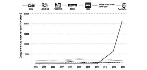 Пример видеоблогера Феликса Арвида Ульфа Чельберга, буквально взорвавшего сеть под псевдонимом PewDiePie, наглядно иллюстрирует изменение структуры спроса на контент. В 2014 году среднее число просмотров роликов, размещенных PewDiePie на YouTube, практически не уступало телеаудитории проходившего в то время финала чемпионата мира по футболу. За финальной игрой Германия – Аргентина наблюдали 26,5 миллиона американцев, но и канал PewDiePie в тот день собрал «урожай» в двадцать с лишним миллионов просмотров[64].