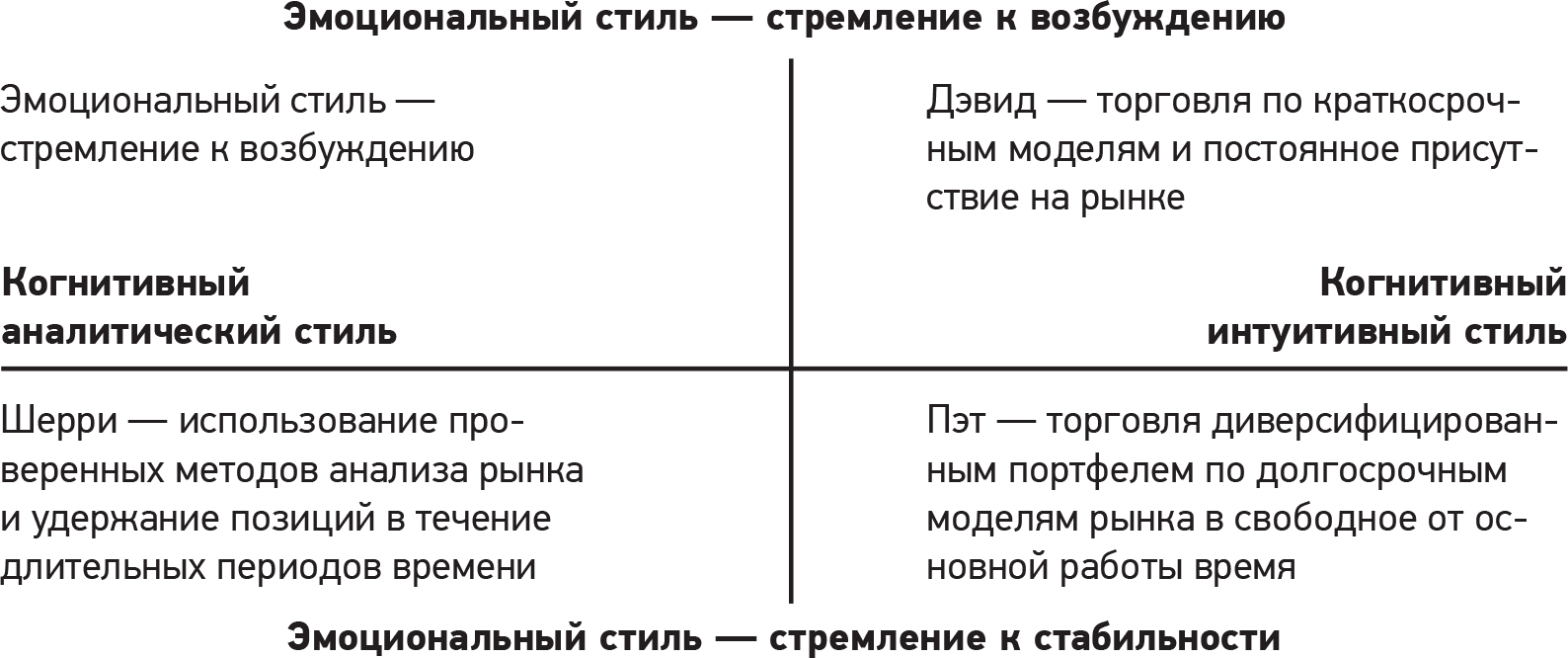На рис. 2 представлена схема, на которой видно пересечение когнитивных и эмоциональных стилей. Каждый из наших четырех трейдеров занимает свой сектор на схеме, и это говорит о том, что они совершенно по-разному воспринимают мир. Поэтому неудивительно, что они подходят к торговле тоже совершенно по-разному. Определив свои когнитивные и эмоциональные стили, мы сможем лучше понять себя и начать процесс идентификации потенциальных рыночных ниш.