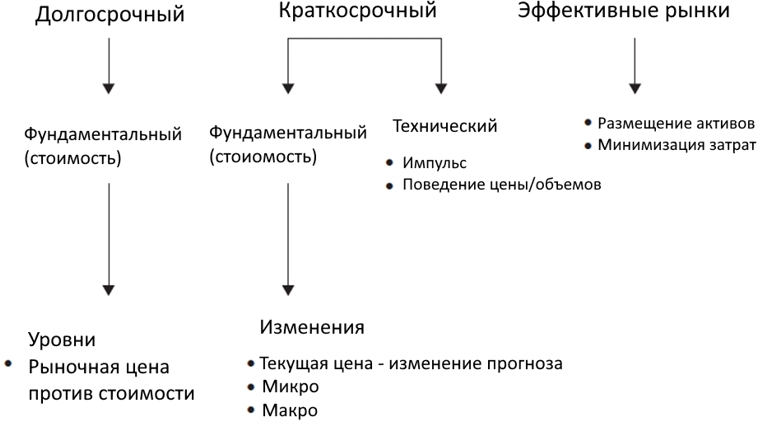Описывая стоимостное инвестирование вкратце и в общих словах, обычно говорят, что стоимостные инвесторы ищут и покупают только «выгодные бумаги», т. е. бумаги, торгующиеся ниже своей внутренней стоимости. Однако это простое определение вызывает вопросы. Ни один разумный инвестор не признает, что ищет ценные бумаги, торгующиеся по цене, превышающей их внутреннюю стоимость. Все хотят купить дешево и продать дорого[1]. Нам нужно четко определить, чем отличаются те, кто инвестирует в реальную стоимость, от всех остальных участников рынка ценных бумаг (см. рис. 1.1).