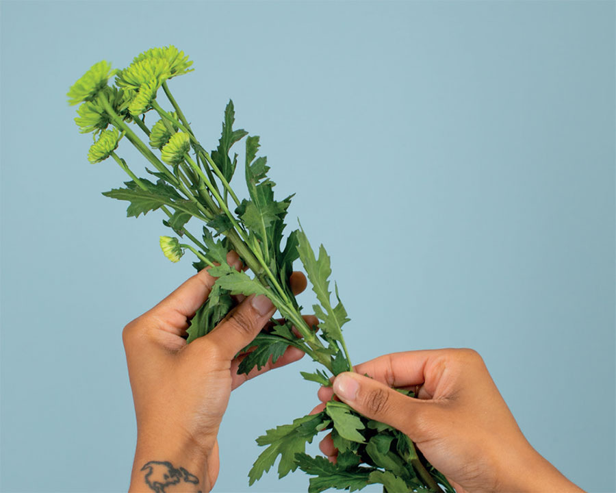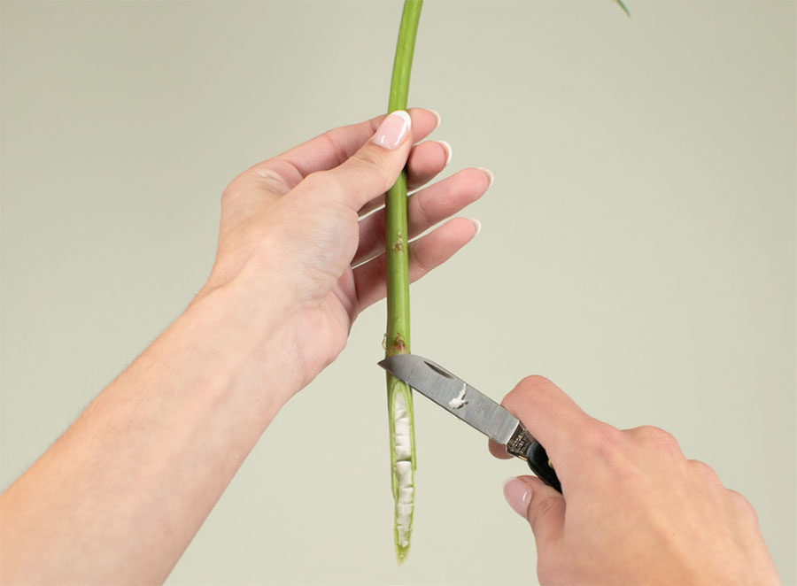 Листву с цветка можно удалить различными способами. Наш любимый – пальцами. Возьмите цветок за верхушку стебля одной рукой, а другой – за стебель, затем аккуратно проведите рукой вниз по стеблю, чтобы снять листву.