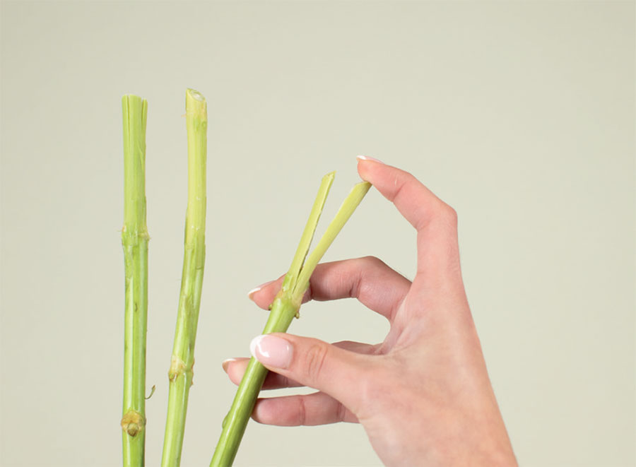 Ветвящиеся стебли некоторых цветов, таких как гортензия и сирень, полезно расщепить и очистить от оболочки. Только не стоит слишком увлекаться этим процессом. Достаточно сломать или расщепить стебель на 2–3 см, чтобы увеличить площадь поверхности соприкосновения с водой.