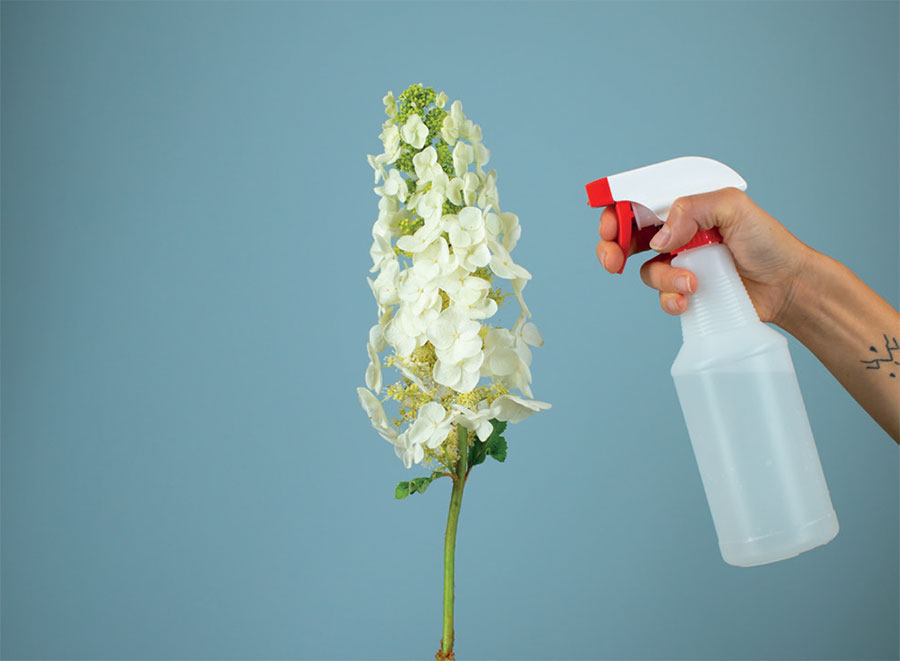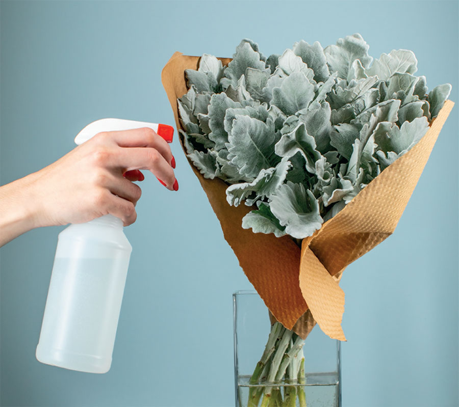 4. ОПРЫСКИВАНИЕ. Некоторые цветы предпочитают увлажнение не снизу вверх, а сверху вниз. Многие сорта любят влажный воздух и не получают достаточного количества влаги, если просто поставить стебли в воду. Флористы используют два метода – опрыскивание и обертывание. Для опрыскивания наполните бутылку с пульверизатором водой и обработайте цветы, как головки, так и стебли. Не распыляйте на цветы слишком много воды, так как это может привести к задержке воды в лепестках, что способствует развитию плесени.