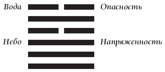 ВЫЖИДАНИЕ. «Объяснение последовательности знаков» гласит: «НЕЗРЕЛОСТЬ – это есть невежественность, это начало развития предмета. Во время начала развития предмета его нельзя не питать, поэтому принимается знаком ВЫЖИДАНИЕ». ВЫЖИДАНИЕ – это Путь пищи и питья, ибо, когда вещь юная и находится в начальной стадии развития, необходимо ждать пока она напитается, будет вскормлена. То, что потребно для питания предмета, – это питье и пища, поэтому говорится, что ВЫЖИДАНИЕ – это Путь пищи и питья. Облака наверху, над Небом, – это образ поднимающихся испарений влаги, так пища и питье питают все предметы. ВЫЖИДАНИЕ – это Путь пищи и питья, и потому идет после НЕЗРЕЛОСТИ, 4. Общий смысл знака выражает необходимость ждать. Природа Напряженности знака Небо стремится к продвижению вперед, но располагается под Опасностью ловушки знака Вода. Эта Опасность является преградой, потому нужно подождать, а после продвигаться вперед.