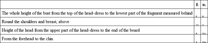 “Our limits prevent us from going into other details, but we have perhaps said enough to induce some of our readers to look more carefully at this curious specimen of Egyptian art; and to examine the rest of the ornamental parts. The following are some of the principal dimensions: —