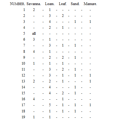 Savanna soil– is of a dark colour, with a large portion of white sand incorporated with it, and is found frequently in New Jersey. A mixture of two-thirds black earth from the woods, and one-third of pure white sand, will be similar to it, and may be used as a substitute, but is not exactly of the same nature.